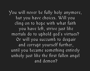 "Not Holy Anymore" is a simple game about choosing between the path of further damnation or perilous atonement. You play as a fallen angel - in what kind of setting, is up to you. But in this game, fallen angels may turn into demonic entity as they fall deeper into despair and their vice.